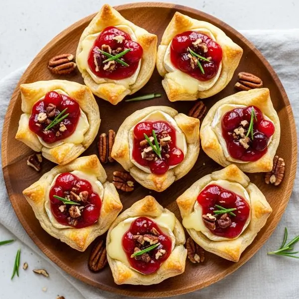 A flaky pastry base holds gooey melted brie topped with sweet-tart cranberry sauce and a crunchy nut or herb garnish.